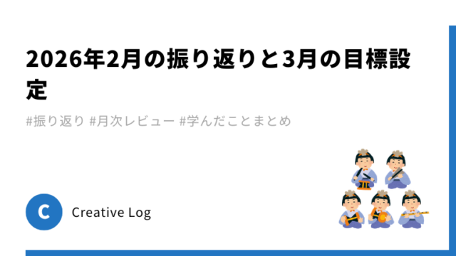 その他 2026年2月の振り返りと3月の目標設定 2026年3月1日 Masaki KANAI Creative Log この記事では、先月の振り返りと当月の目標を共有します。 2026年に意識すること 発信する ← 最重要 社会のためになりそうなことをイメージする アート …
