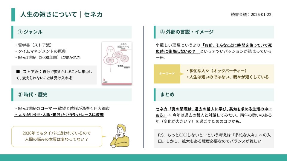 2026年1冊目の本は「人生の短さについて」を読みました。年初なので少し重めなテーマの本を選択。簡単なまとめは以下の通りです↓