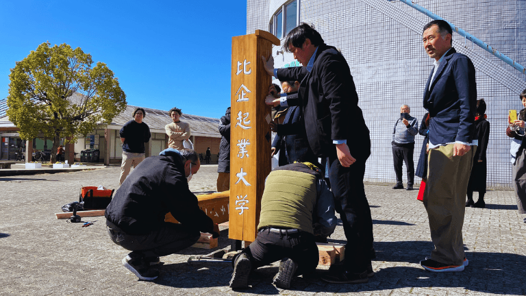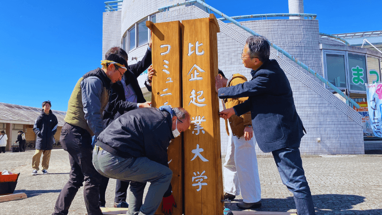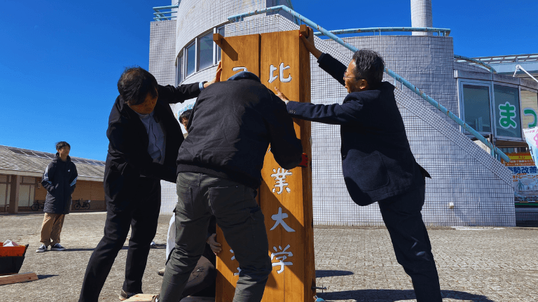 わっしょい祭りとは、「比企起業大学」と書かれた丸太看板を「わっしょい!わっしょい!」言いながら運び、看板を設置するお祭りです。2本目となる今年は埼玉県鳩山町に建立されました。